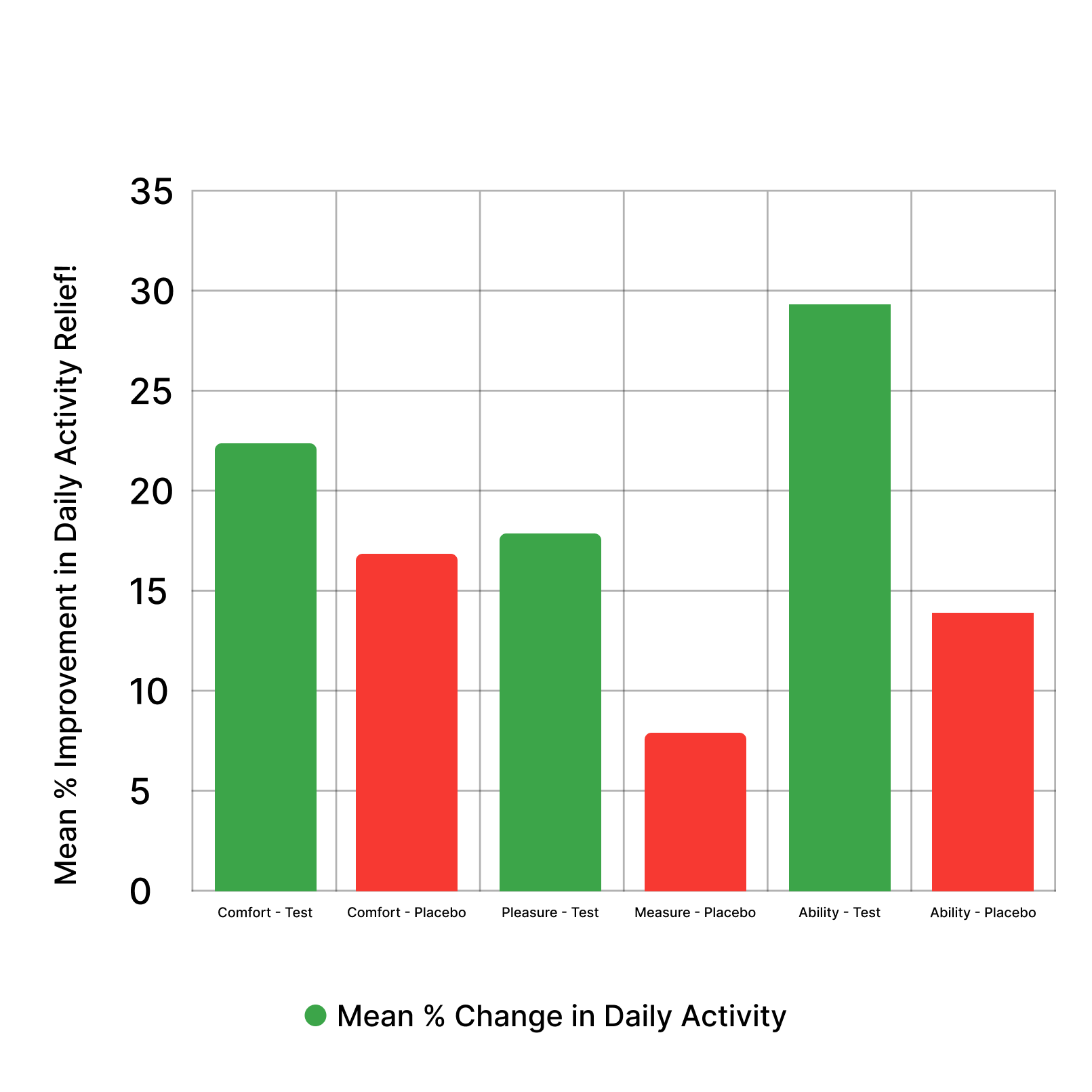At 12 weeks, a -23.68% improvement in satisfaction with day-to-day activity levels (vs. -4.40% placebo) suggests Remedolor may help users feel more content with their mobility and routine.