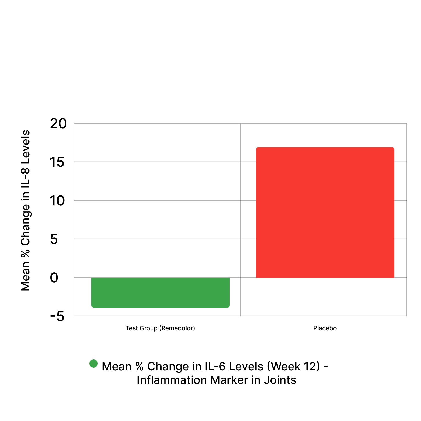 "IL-6 is a natural substance in your body that can increase when joints experience inflammation or discomfort, often seen in conditions like everyday wear and tear or stiffness. Keeping IL-6 levels in check may support healthier, more comfortable joints. By Week 12, the test group (Remedolor) demonstrated reduced IL-6 levels by -2.31%—a beneficial decrease in this common joint inflammation marker—while the placebo group showed a significant increase of +16.95%, resulting in a ~19% better outcome for the test group.